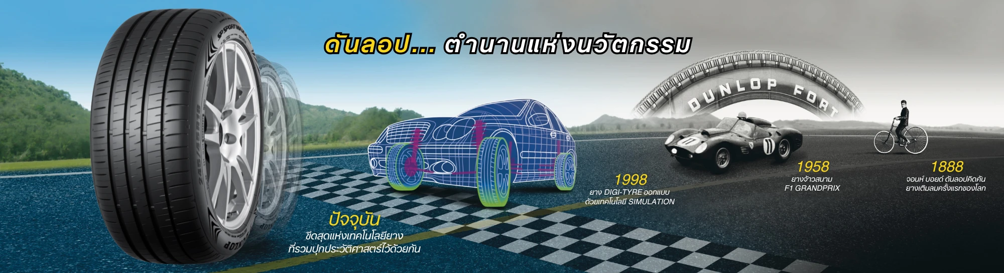 ในปี ค.ศ. 1888 โลกได้รู้จักกับนวัตกรรม ยางรถยนต์แบบเติมลม เป็นครั้งแรกภายใต้ชื่อชื่อแบรนด์ “DUNLOP” ซึ่งเป็นยางที่รองรับแรง กระแทกด้วยอากาศเป็นครั้งแรกในประวัติศาสตร์ ตั้งแต่นั้นมา DUNLOP ได้กลายเป็นสัญลักษณ์แห่ง สมรรถนะ ความทนทาน และเทคโนโลยีล้ำสมัย