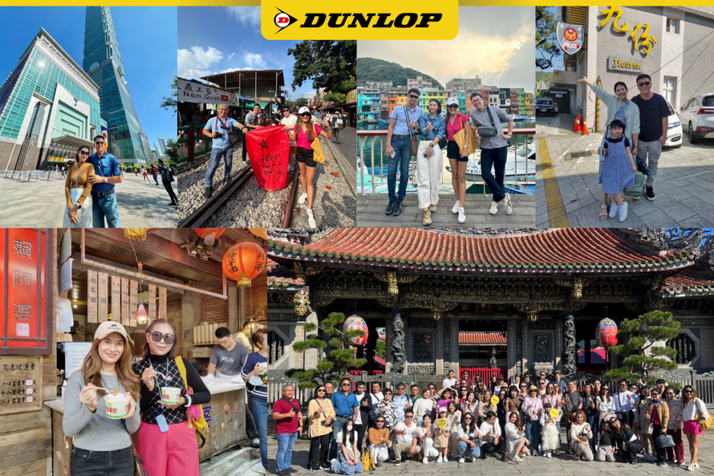 บริษัท ดันลอป ไทร์ (ไทยแลนด์) จำกัด นำโดยทีมคณะผู้บริหารและพนักงาน พาร้านค้าตัวแทนจำหน่ายยางดันลอป ท่องเที่ยว ณ ประเทศไต้หวัน ระหว่างวันที่ 4-7 พฤศจิกายน พ.ศ. 2566 ที่ผ่านมา รอบนี้ดันลอปเริ่มต้นทัวร์โดยการพาไปเที่ยว “หมู่บ้านโคมแดง” ในเมืองจิ่วเฟิ่น แหล่งท่องเที่ยวโบราณยอดฮิตของประเทศไต้หวัน แวะชิมขนมขึ้นชื่อแสนอร่อยของหมู่บ้านนี้ ต่อด้วยการปล่อยโคมลอยที่ “ถนนสือเฟิ่น” แล้วเดินทางกันต่อไปที่ “ท่าเรือประมงเจิ้งปิน” แวะถ่ายรูปเช็คอินกับบ้านสีรุ้ง แล้วพาทุกคนไปร่วมเปิดประสบการณ์ใหม่ ด้วยการปั่นจักรยานชมวิวมหาสมุทรแปซิฟิกที่ “SHEN ‘AO RAIL BIKE” ต่อด้วยการช้อปปิ้งสุดมันส์ที่ ซื่อหลินไนท์มาร์เก็ต และเดินทางกันไปตอนใต้สุดของไทเป ให้ทุกท่านได้ขึ้น “กระเช้าเมาคง” ชมวิวทิวทัศน์ 360 องศา พร้อมกับให้ทุกท่านได้ลองลิ้มชิมรสไอศกรีมชาเขียวสุดแสนอร่อย แล้วกลับมาถ่ายรูปเช็คอินหน้า “ตึกไทเป 101” ก่อนเดินทางกลับ แวะถวายของมงคล ขนมจันอับที่ “วัดหลงซาน” เพื่อความเป็นสิริมงคลแก่ตัวแทนจำหน่ายยางดันลอปทุกท่าน เฮงๆ ค้าขายร่ำรวย บรรยากาศตลอดทั้งทริป เต็มไปด้วยความสนุกสนานและความเป็นกันเองของคณะผู้บริหารและร้านค้าตัวแทนจำหน่าย