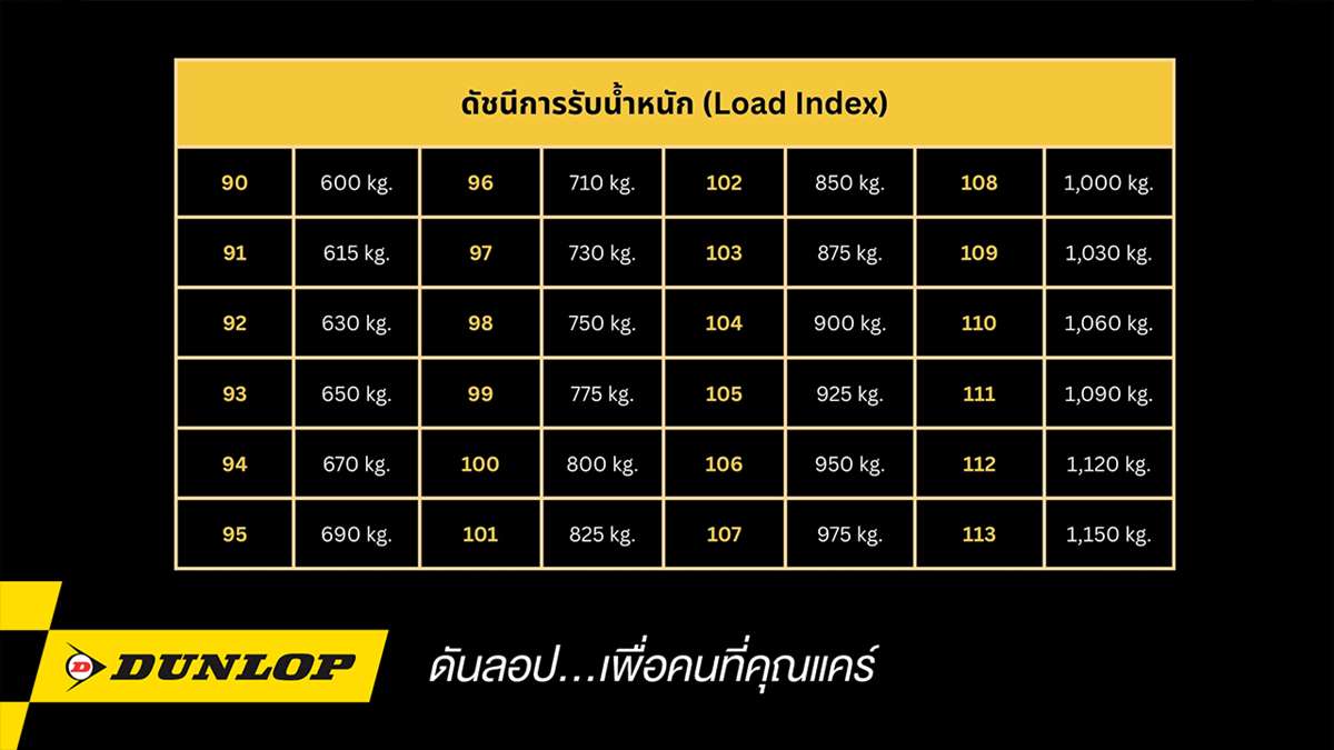 ยกตัวอย่างเช่น ต้องการใช้รถตู้ หรือรถ MPV เพื่อโดยสาร โดยมีขนาดยางที่เหมาะสมกำหนดไว้อยู่ที่ 205/65R16 95H เมื่อนำตัวเลข 95 ไปเปรียบเทียบกับตารางดัชนีการรับน้ำหนัก (ดังภาพด้านล่าง) จะพบว่ายางหนึ่งเส้นสามารถรับน้ำหนักได้ที่ 690 กิโลกรัม เท่ากับว่า เมื่อใช้ยางไซส์นี้ทั้งหมด 4 เส้น สามารถรองรับน้ำหนักและการบรรทุกได้มากถึง 2,760 กิโลกรัม ซึ่งถ้าหากเป็นปริมาณที่พอดีแล้วก็สามารเลือกใช้ยางรถตู้ หรือรถ MPV ไซส์นี้ได้เลย